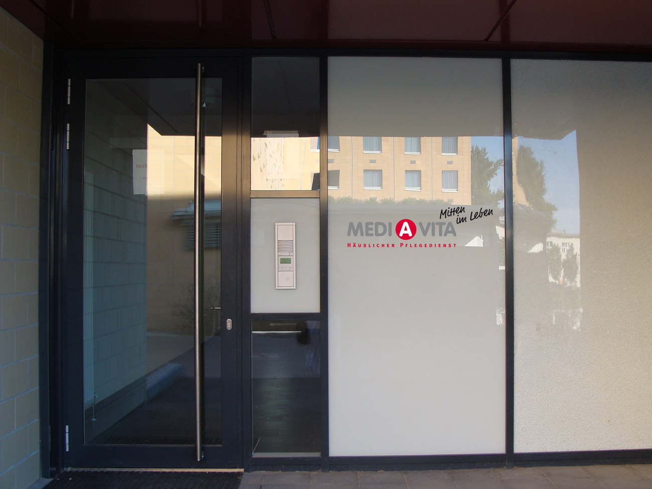 Idee, Gestaltung und Produktion der Leuchtwerbeanlage sowie Türfolierung inklusive Montage.