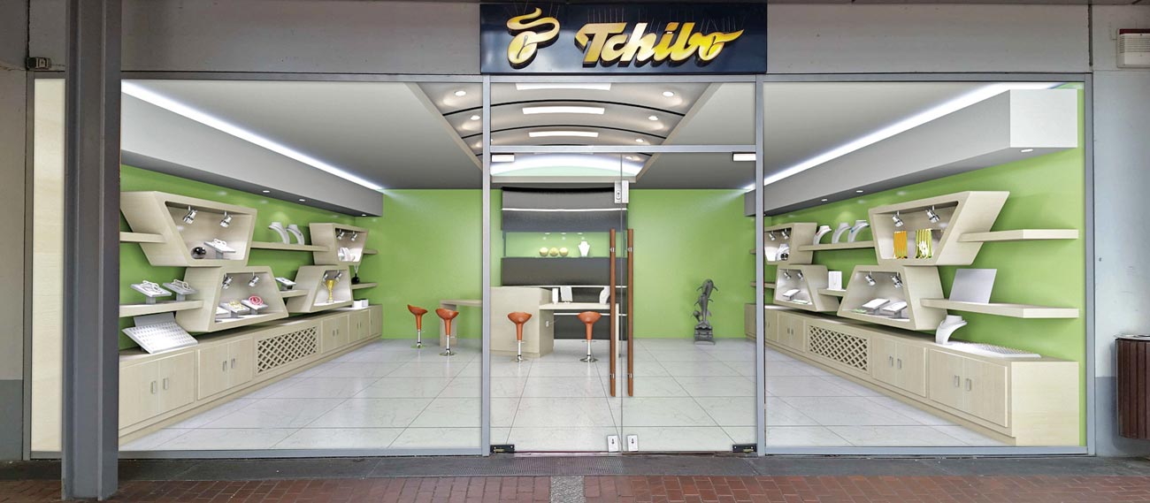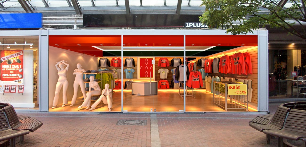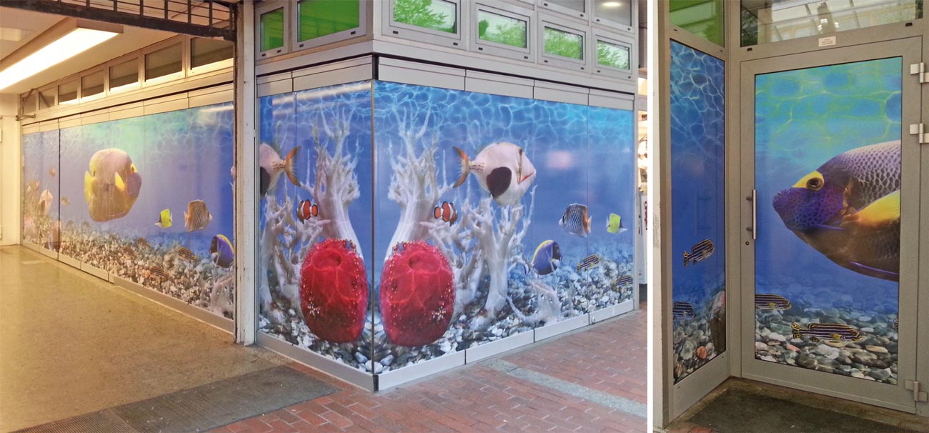Leerstandsbeklebung für nicht vermietete Ladenflächen: Anpassung von 3-D-Aufnahmen auf gesamte Schaufensterflächen inkl. Bildbearbeitung und Produktionsabwicklung.